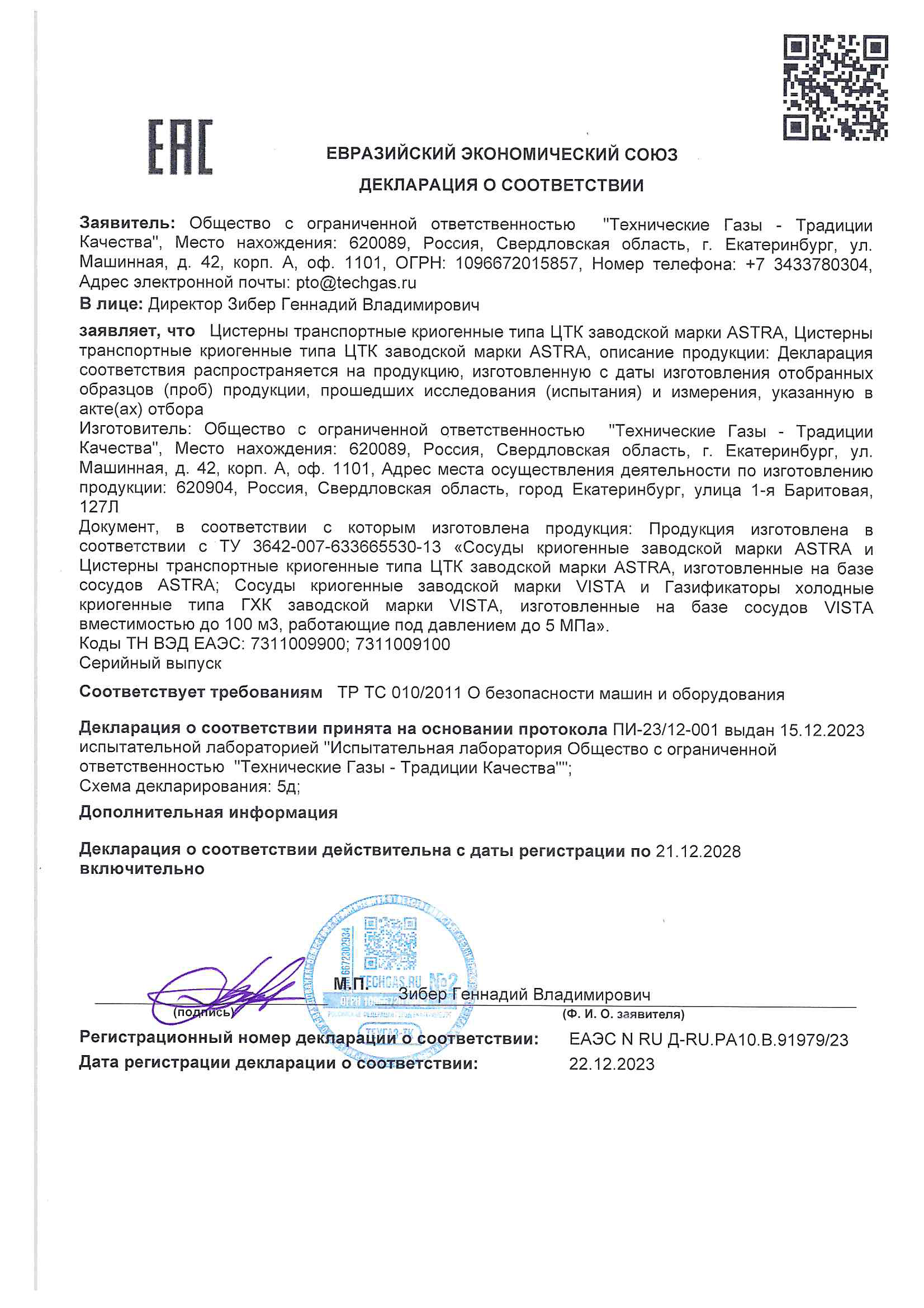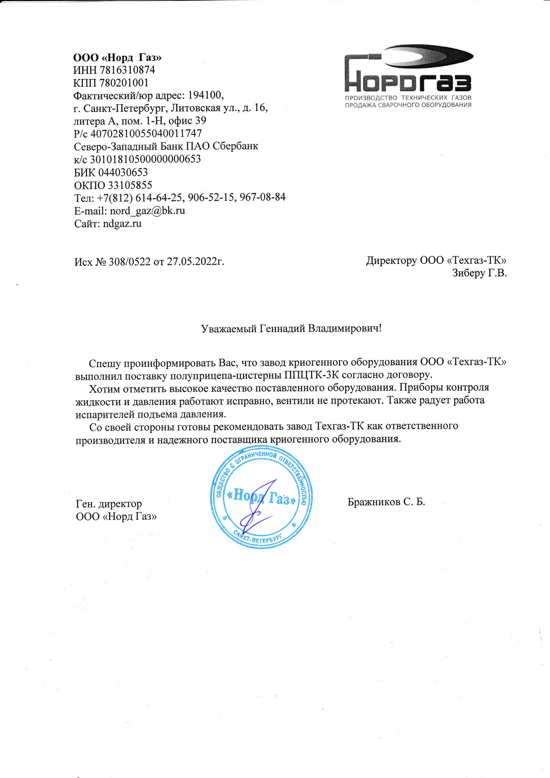 Со своей стороны готовы рекомендовать завод “Техгаз-ТК“ как ответственного производителя и надежного поставщика криогенного оборудования».
