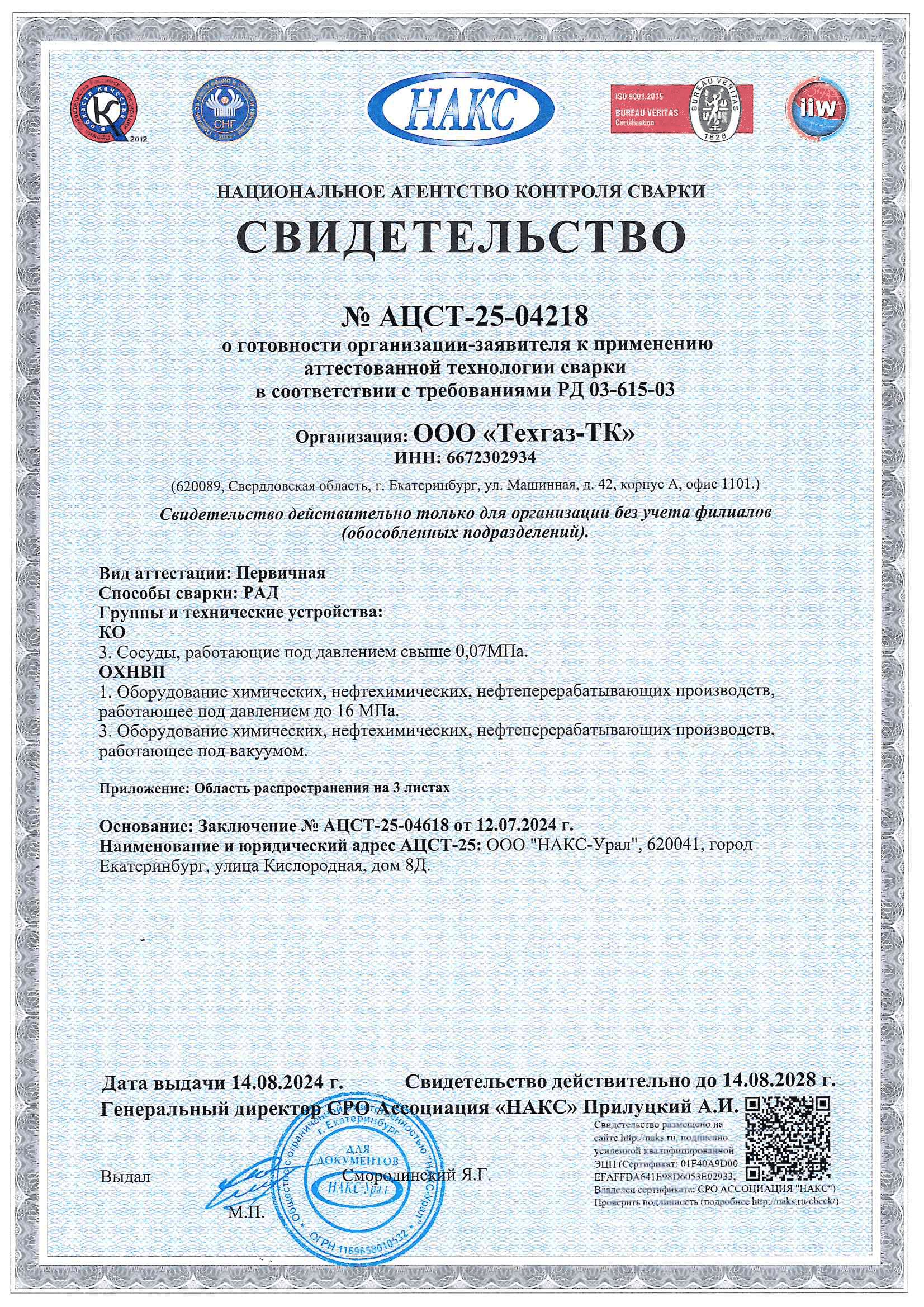 Наши сварщики проходят обучение и сертификацию НАКС, согласно требованиям Ростехнадзора