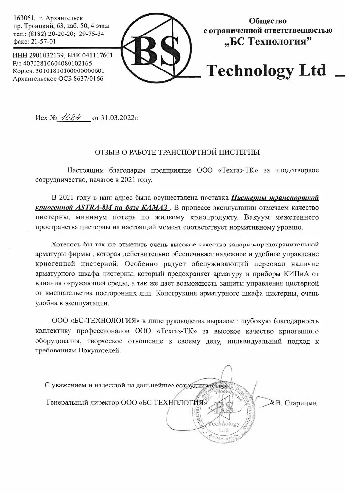 ООО «БС-ТЕХНОЛОГИЯ» в лице руководства выражает глубокую благодарность коллективу профессионалов ООО «Техгаз-ТК» за высокое качество криогенного оборудования, творческое отношение к своему делу, индивидуальный подход к требованиям Покупателей.