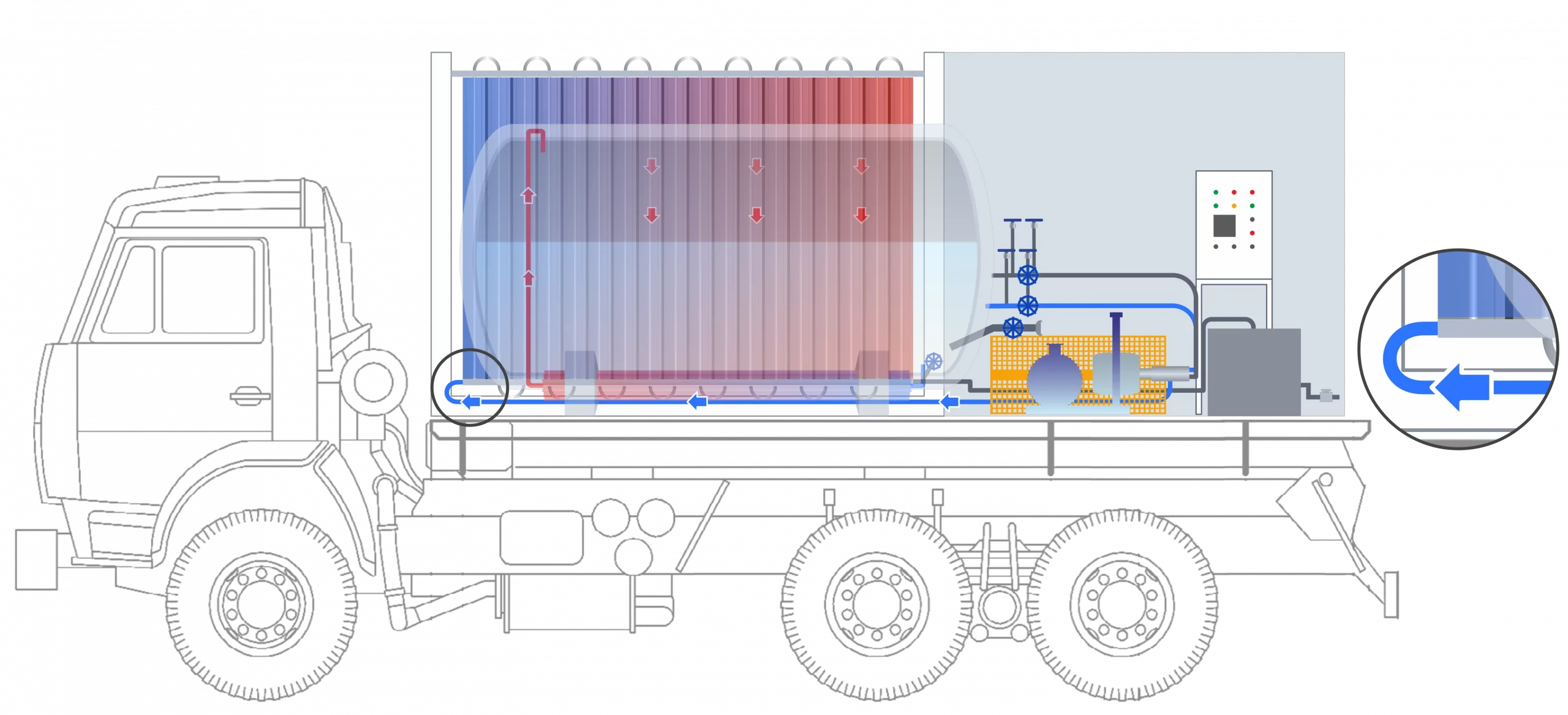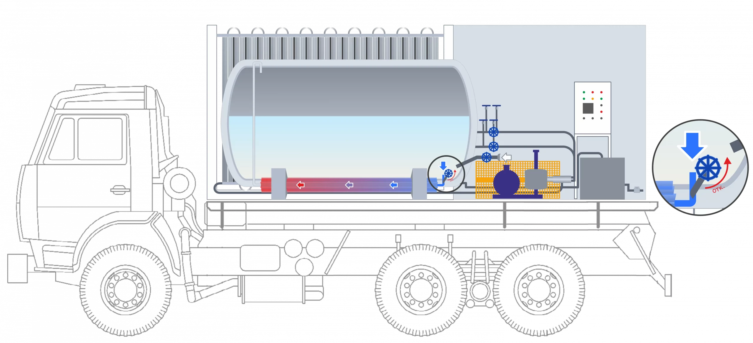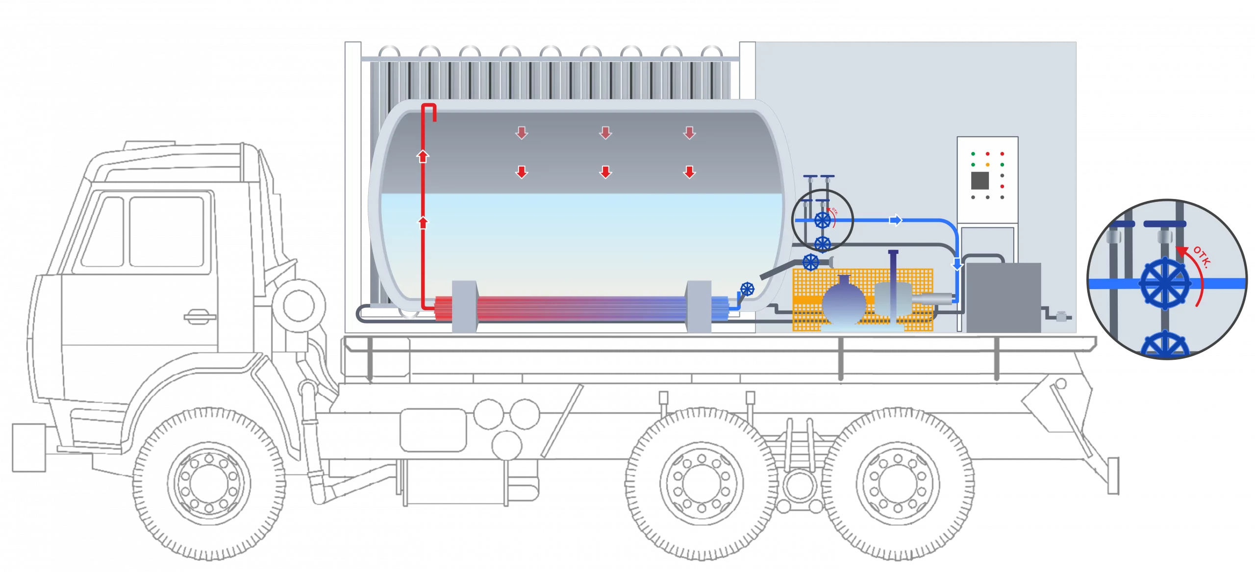 Оператор открывает 2 вентиля: «Подъем давления» и «Жидкость в насос». Сжиженный газ самотеком под действием силы тяжести поступает в испаритель подъема давления. Там криопродукт газифицируется за счет температуры окружающей среды.