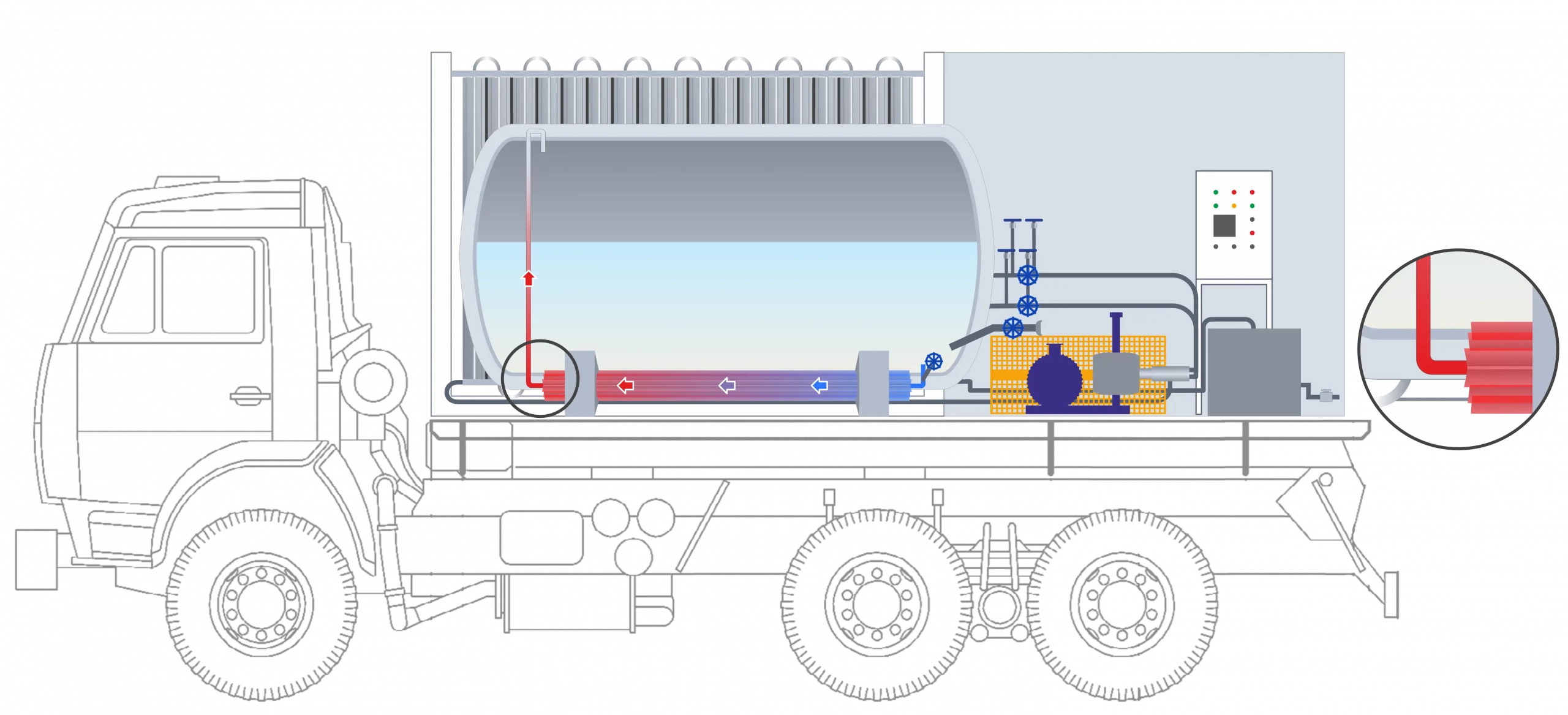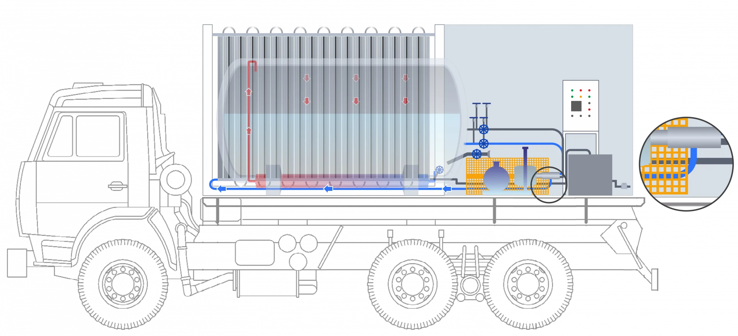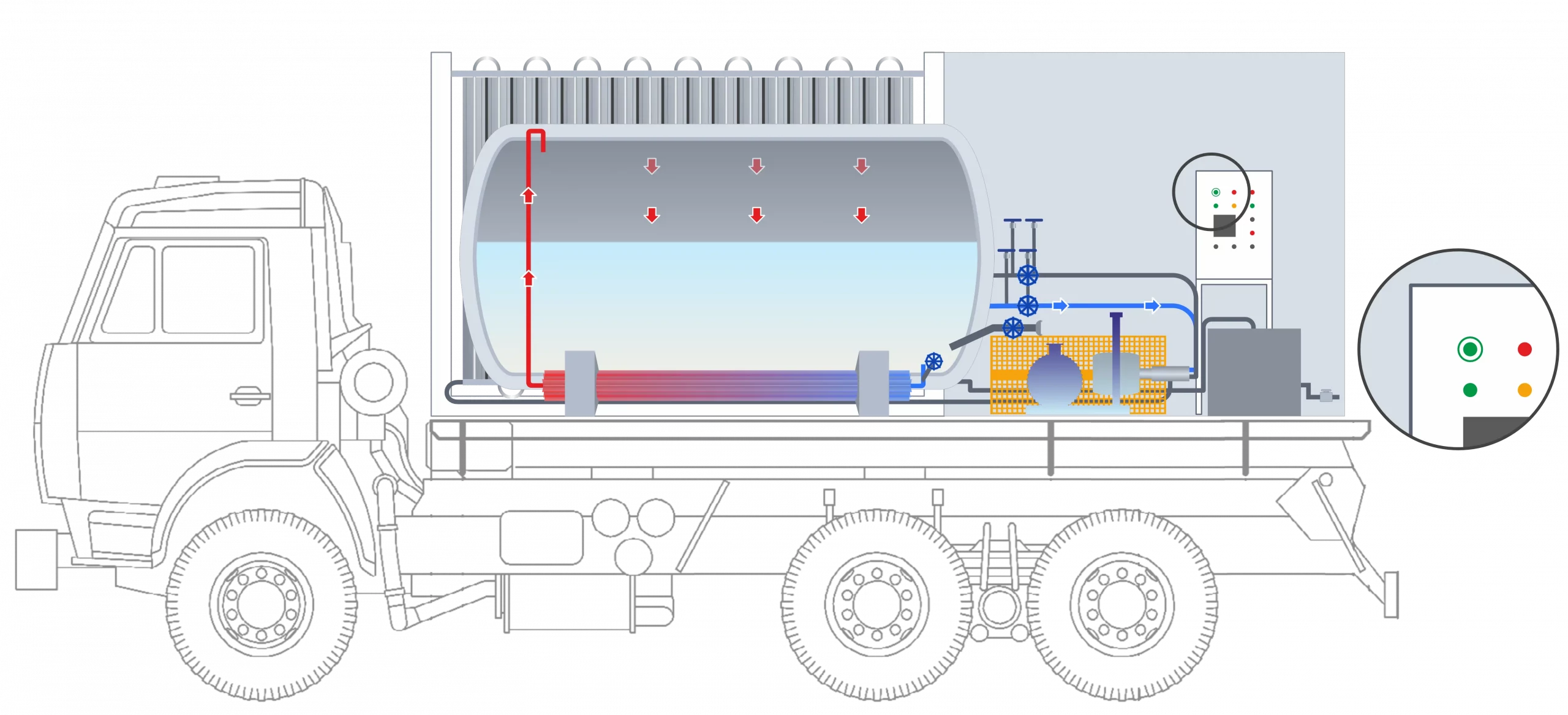 После прохождения атмосферного испарителя продукт по трубопроводу идет к жидкостному догревателю. Автоматика считывает температуру на входе и регулирует нагрев ТЭНов так, чтобы на выходе потребитель получил газообразный продукт заданной оператором температуры.