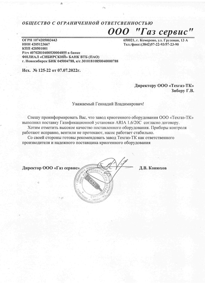 «Завод криогенного оборудования ООО “Техгаз-ТК“ выполнил поставку газификационной установки ARIA согласно договору. Хотим отметить высокое качество поставленного оборудования. Приборы контроля работают исправно, вентили не протекают, насос работает стабильно.