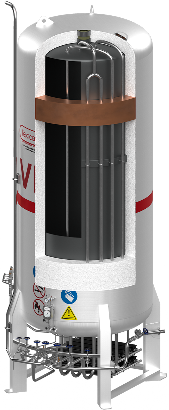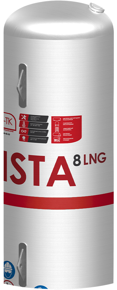 Газификатор СПГ VISTA LNG вертикального исполнения представляет собой криогенный сосуд из нержавеющей стали с вакуумно-перлитной изоляцией в кожухе из нержавеющей стали. Изделие оборудовано системой трубопроводов, двумя комплектами запорно-предохранительной арматуры, пневмоприводами на вентилях наполнения / выдачи / газосброса, контрольно-измерительными приборами и опорами.