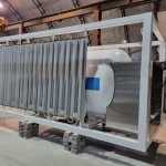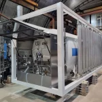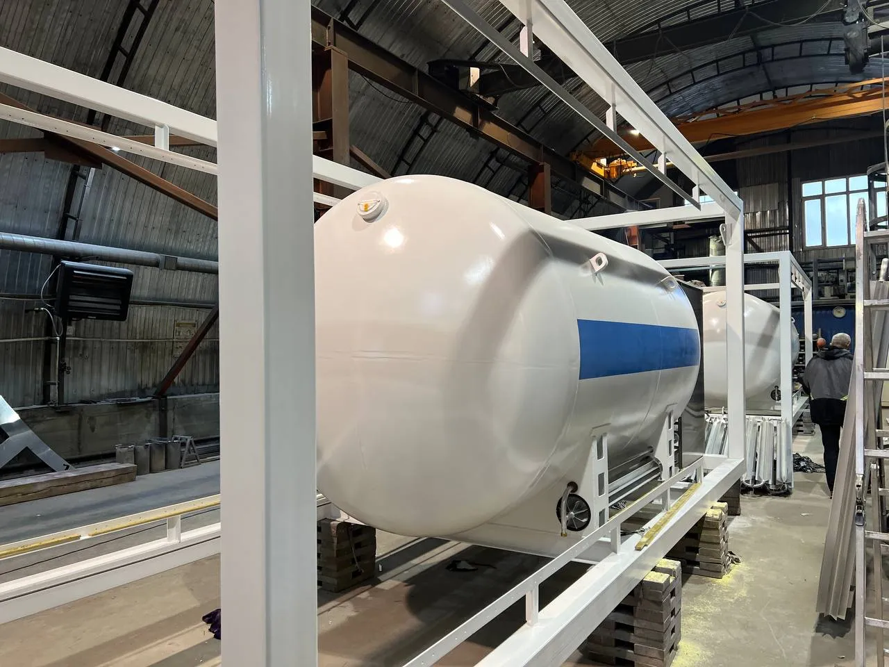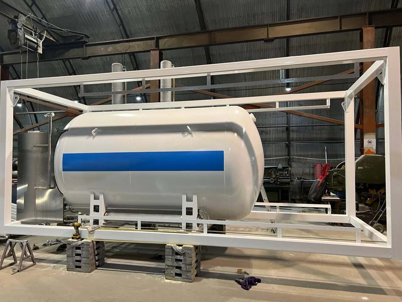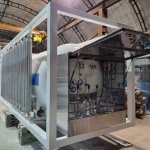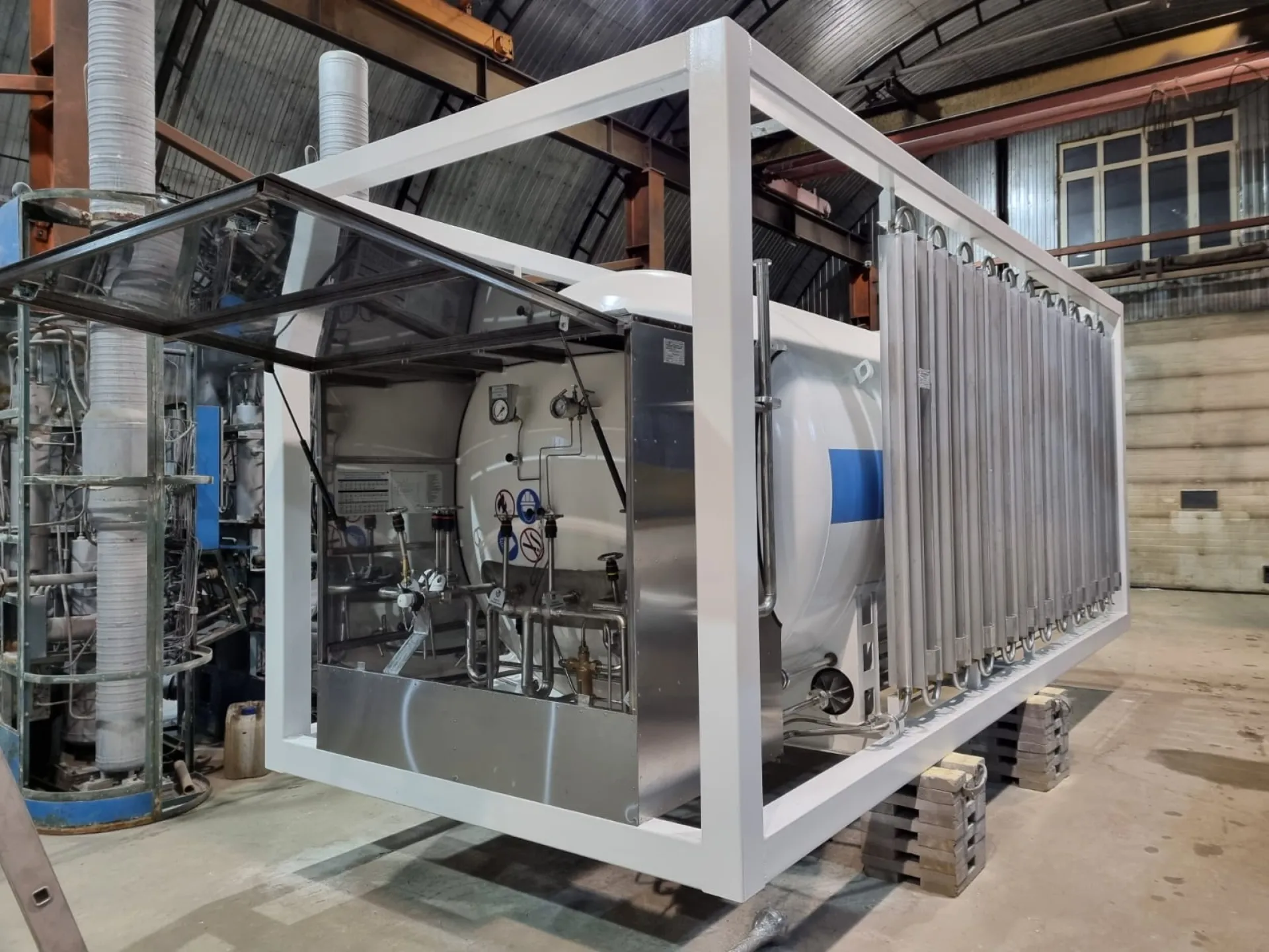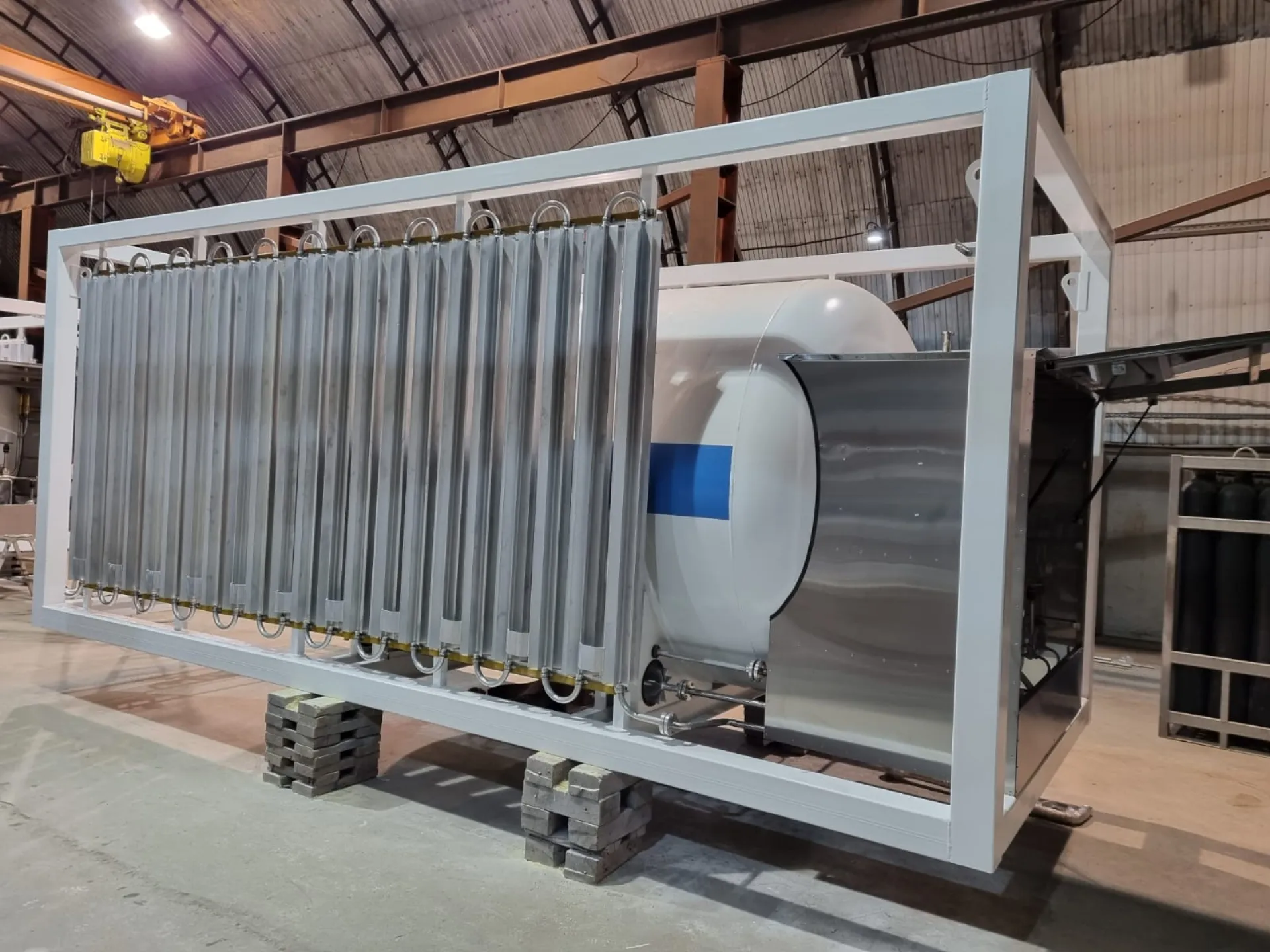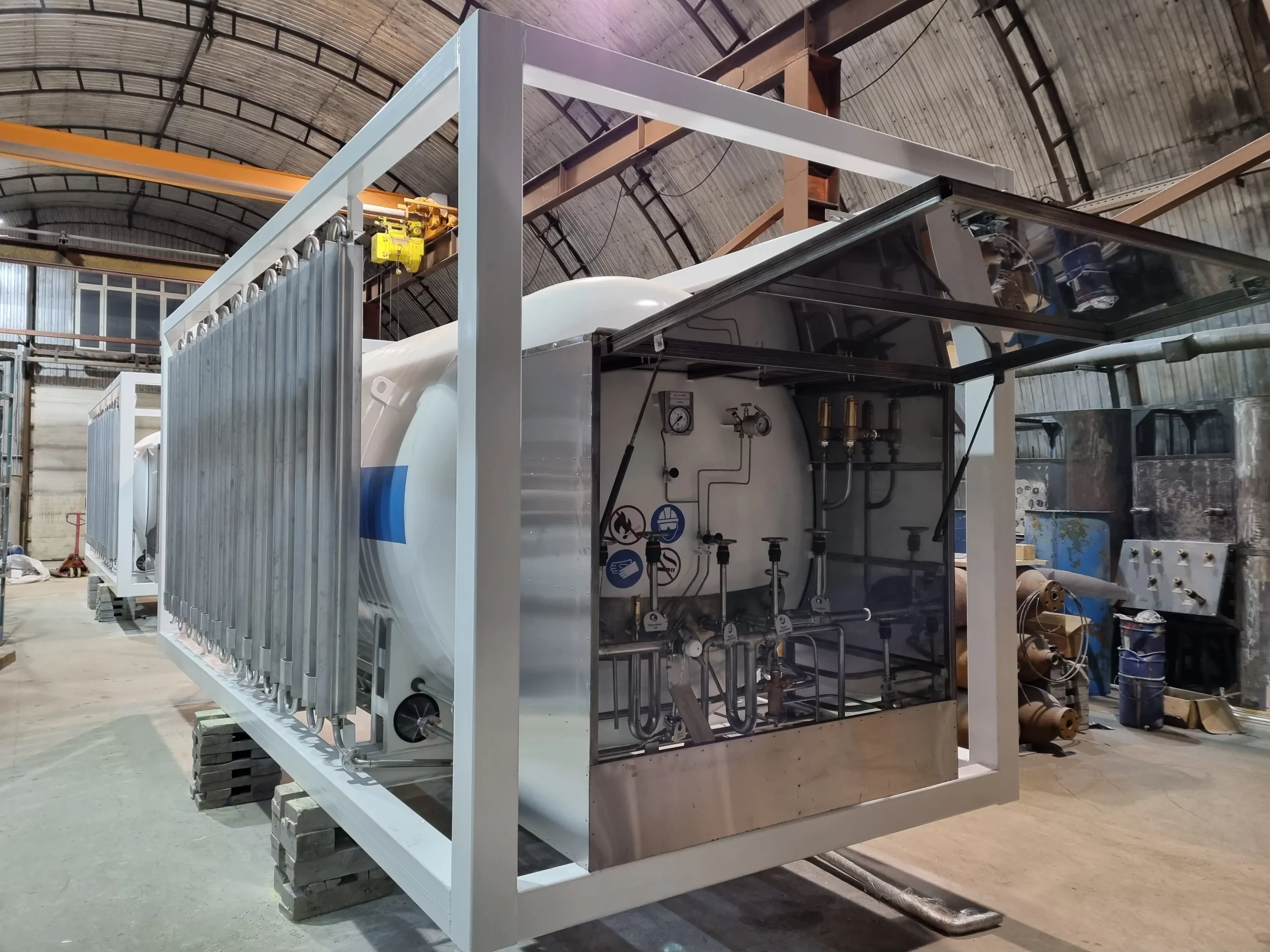 1. В каркасе. Криогенная емкость и продукционный атмосферный испаритель крепятся на сварной металлической раме контейнерного типа. При необходимости с газификатором может быть поставлен отдельно стоящий продукционный атмосферный испарить серии Гелиос.