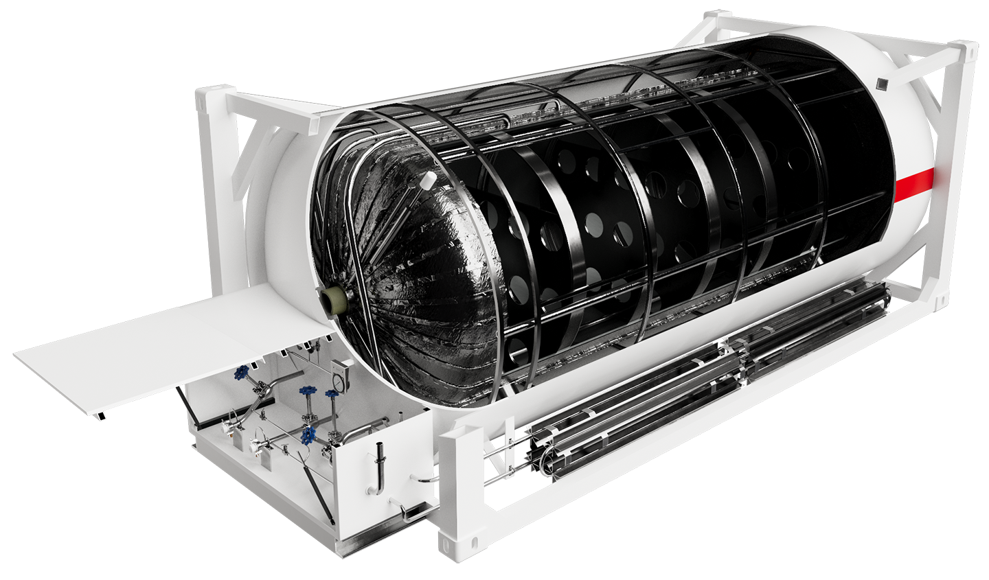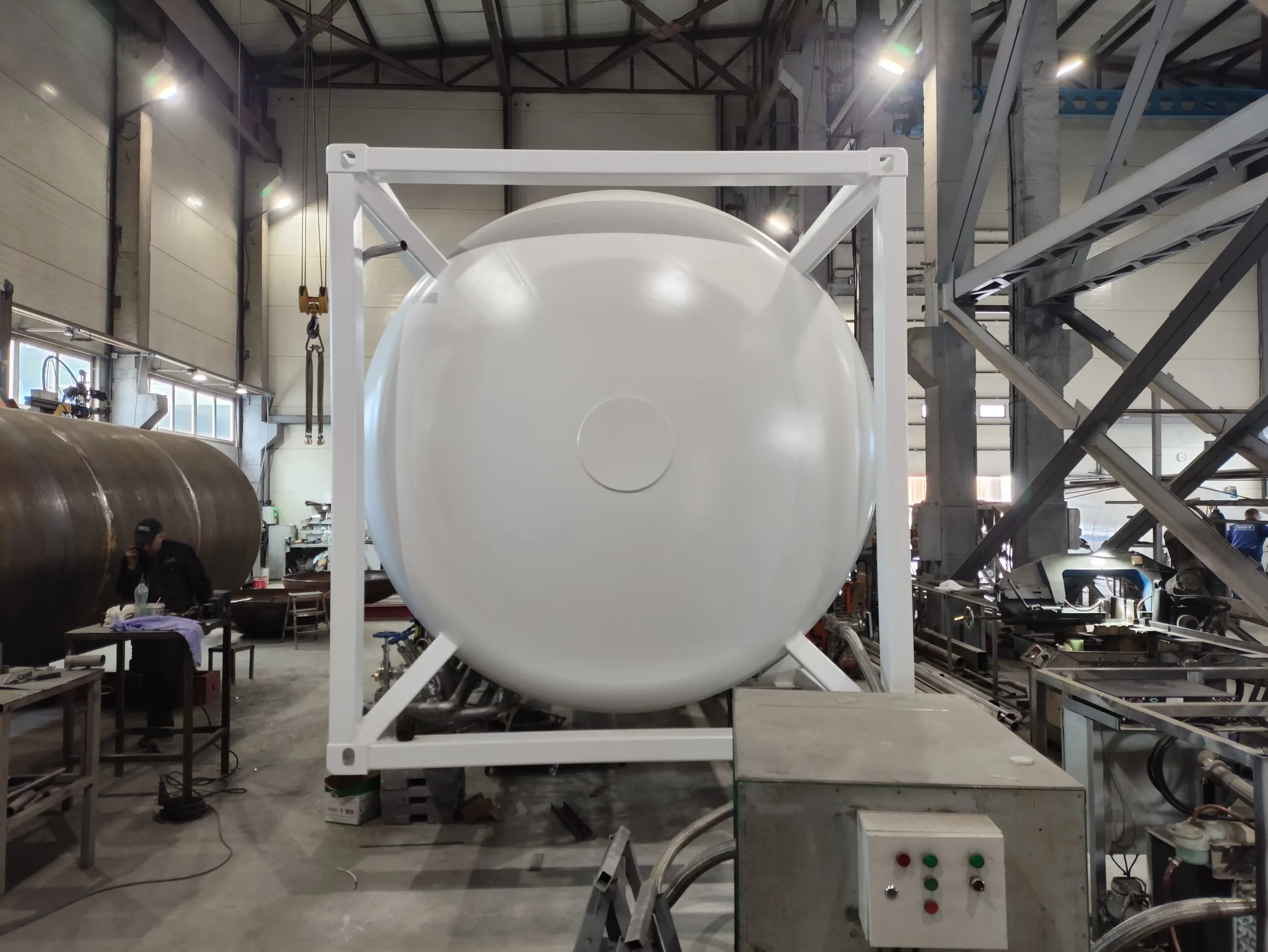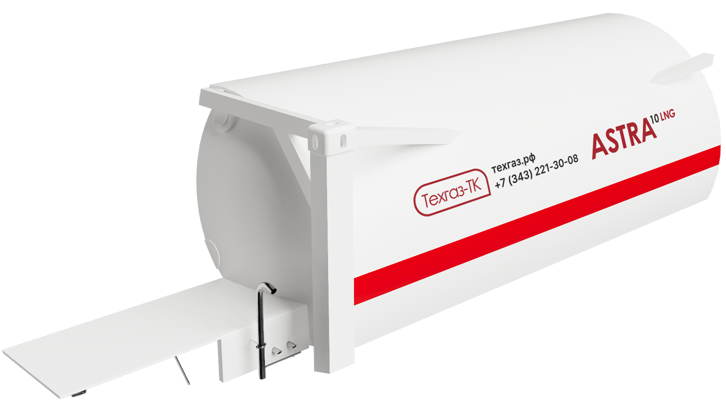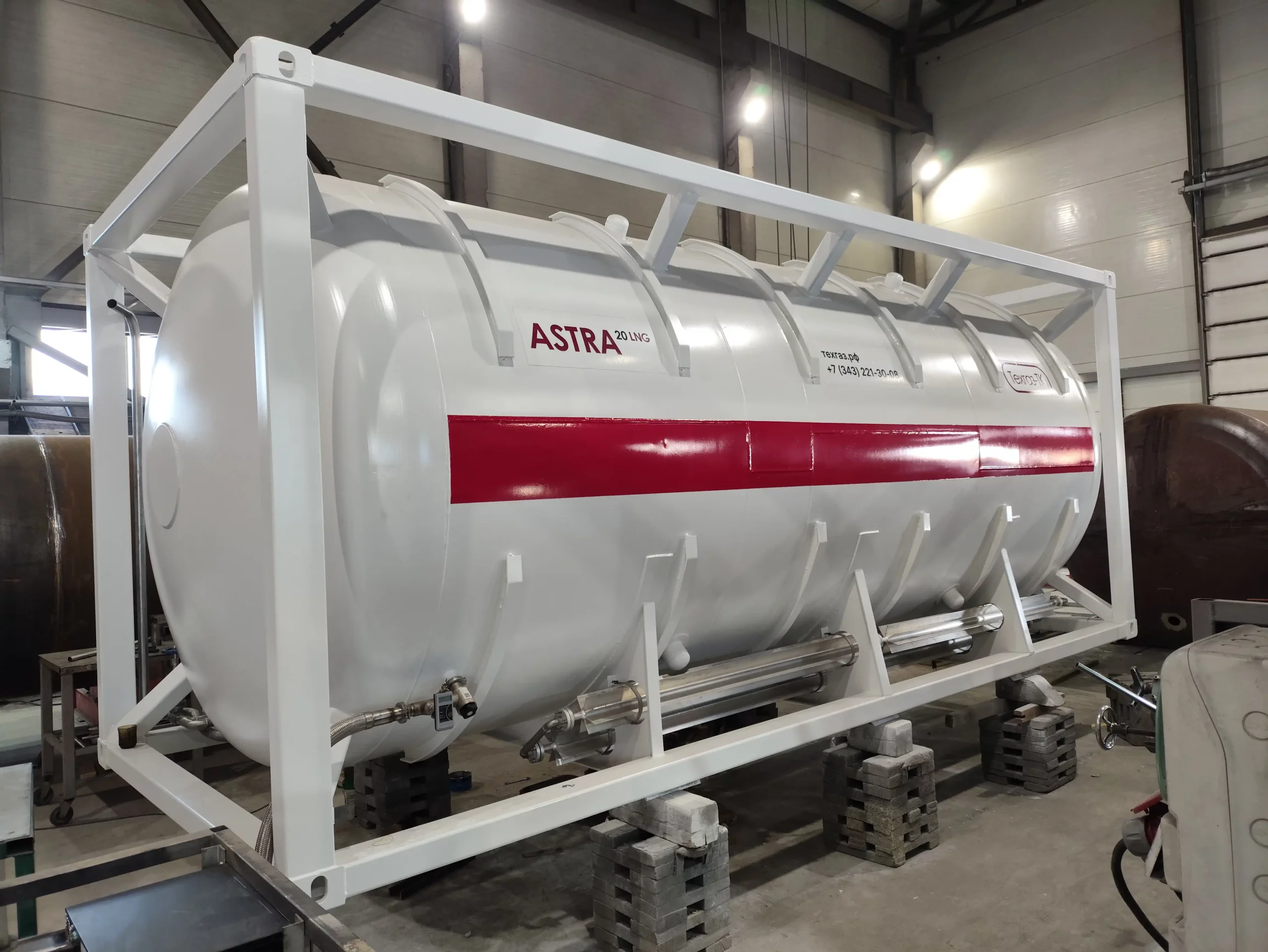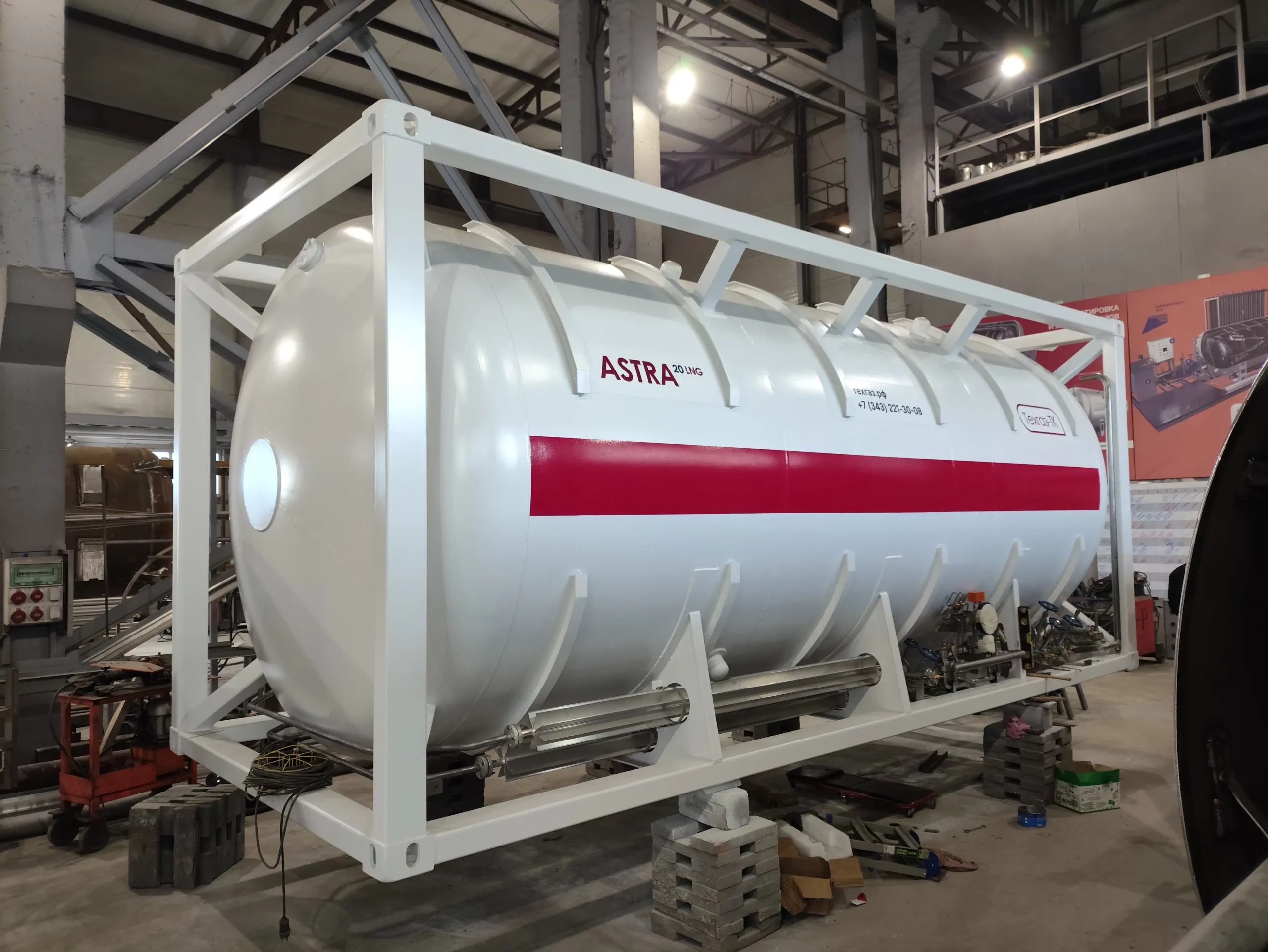 Танк контейнер СПГ ASTRA LNG изготавливается в сварной металлической раме контейнерного типа. Каркас снабжен подъемными проушинами, что позволяет устанавливать криотанк не только на фундамент, но также на трал, платформу или грузовой автомобиль. Также стальная сварная рама позволяет размещать изделие на бетонной площадке, что удобно для тех предприятий, у которых нет возможности возводить стандартный фундамент.