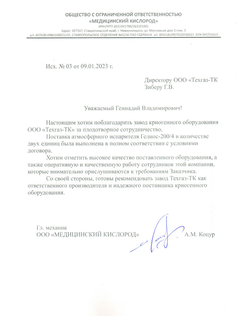 Со своей стороны готовы рекомендовать завод “Техгаз-ТК“ как ответственного производителя и надежного поставщика криогенного оборудования».