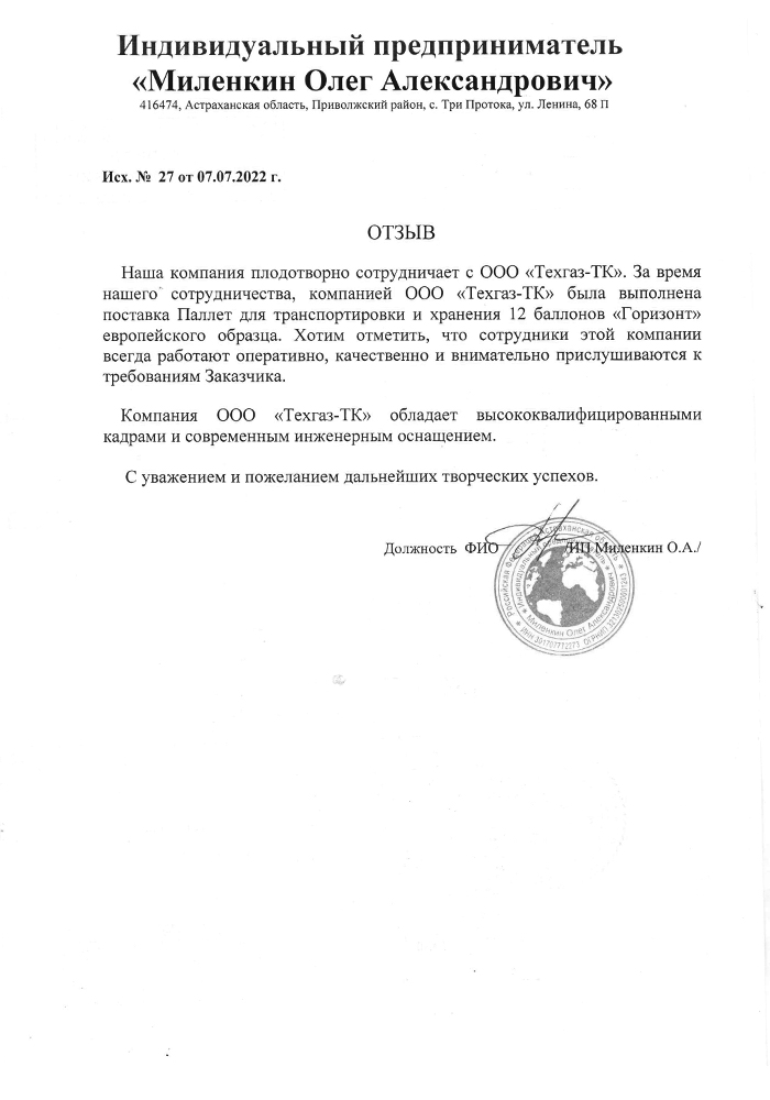 «За время нашего сотрудничества, компанией ООО “Техгаз-ТК“ балы выполнена поставка паллет для транспортировки и хранения 12 баллонов “Горизонт“ европейского образца. Хотим отметить, что сотрудники этой компании всегда работают оперативно, качественно и внимательно прислушиваются к требованиям Заказчика. Компания ООО “Техгаз-ТК“ обладает высококвалифицированными кадрами и современным оснащением».