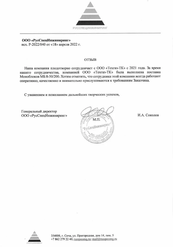 «Наша компания плодотворно сотрудничает с ООО “Техгаз-ТК“ с 2021 года. За время нашего сотрудничества компанией ООО “Техгаз-ТК“ была выполнена поставка моноблоков МБ 8-50/200. Хотим отметить, что сотрудники этой компании всегда работают оперативно, качественно и внимательно прислушиваются к требованиям Заказчика».