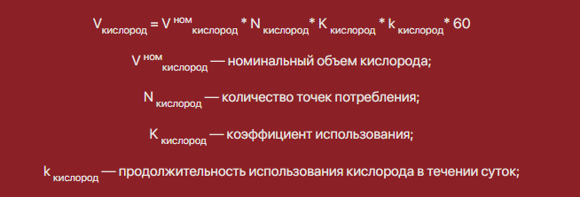 Медицинские газификаторы, как правило, используются в качестве первичного и вторичного источника кислорода, а значит в обоих случаях кислорода в них должно хватить минимум на 5 суток. Рассчитать суточную потребность больницы в кислороде нам поможет следующая формула: