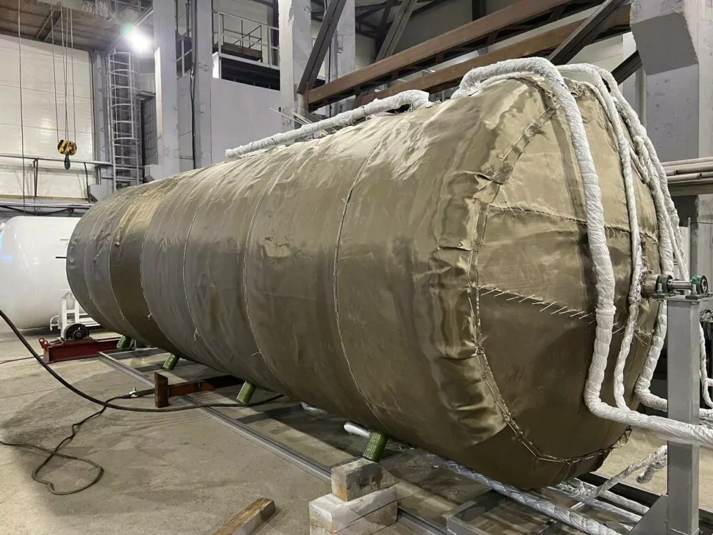 Следующий этап — намотка изоляционного слоя. Вот она, наша маленькая сенсация! С марта 2022 года мы можем производить весь модельный ряд транспортных цистерн с экранно-вакуумной изоляцией. Это настолько эффективный материал, что его используют при изготовлении космических кораблей для защиты от экстремальных температур.